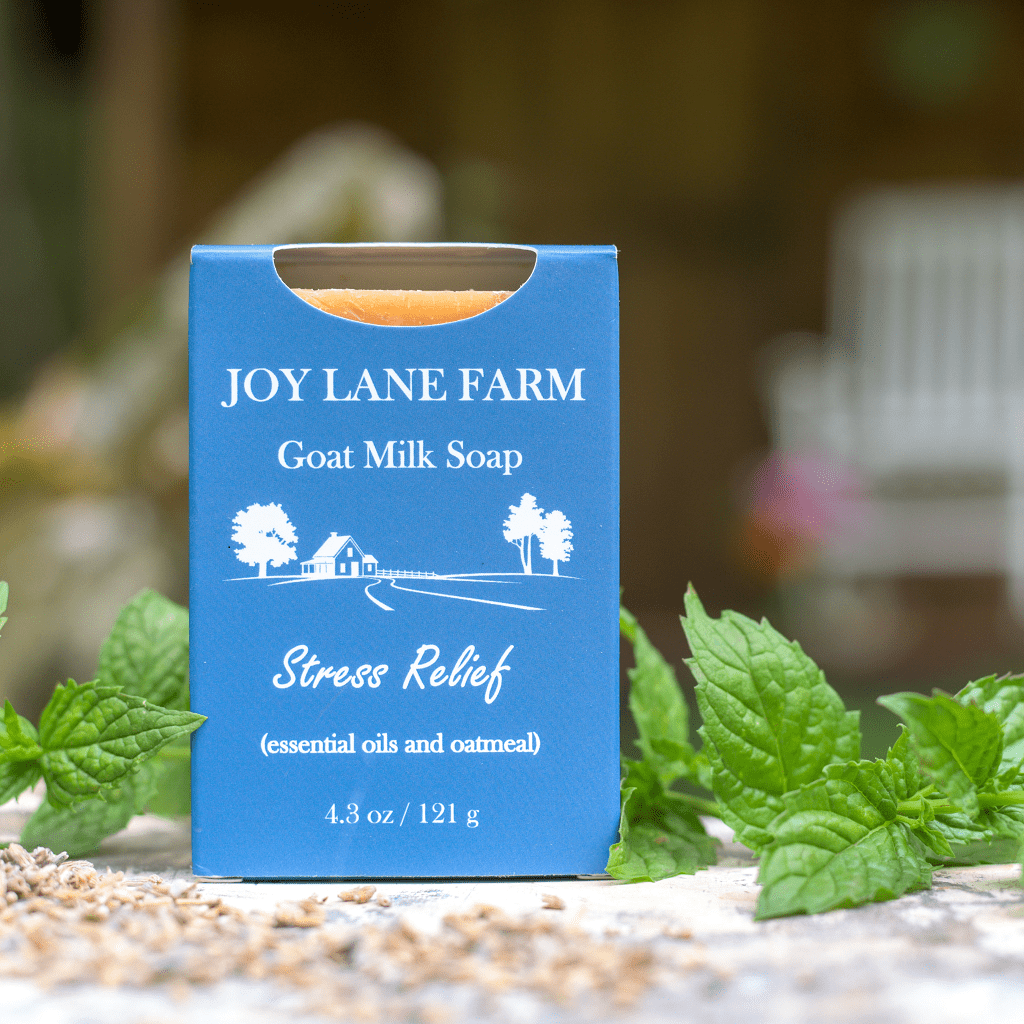 The Stress Relief Goat Milk Soap is pleasantly scented with our custom blend of pure, natural lavender and peppermint essential oils. Ground oatmeal is added for gentle exfoliation. Once the bars are cut, they’re cured for four weeks and then aged to make them extra long-lasting.